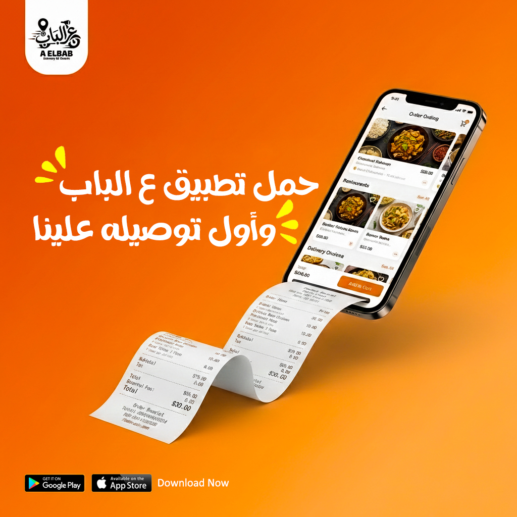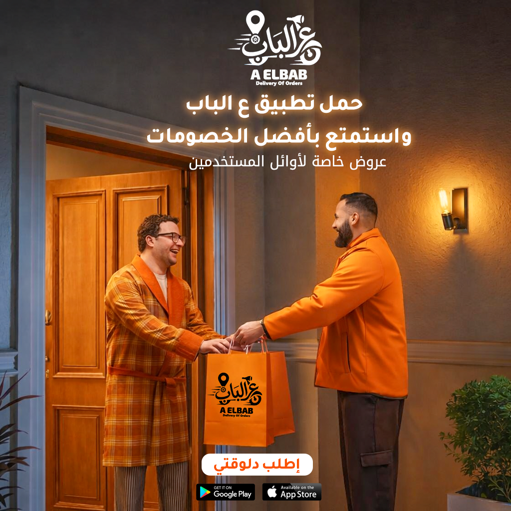"حمل تطبيق ع الباب.. واختصر وقتك، أسرع دليفري ، وأجمد العروض مستنياك مع ع الباب"